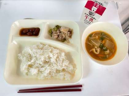 豚肉の甘辛焼き、とうがんのみそ汁、金時豆の煮もの、ごはん、牛乳