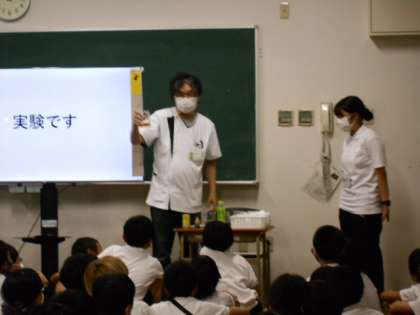 はじめにお薬の実験では、水以外と混ぜたときに色が変わったり色がなくなったりする様子を見せていただきました。