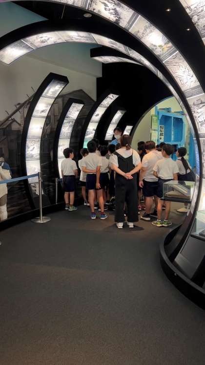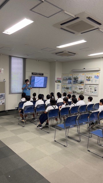 グループに分かれて、担当の方からお話を聞きます。前半は、高潮について学習しました。みんな真剣に話を聞いています。