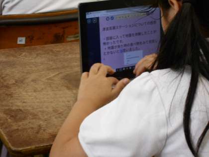 学んだことや感想をタブレットに入力し、共有メニューでお互いの考えを交流しました。