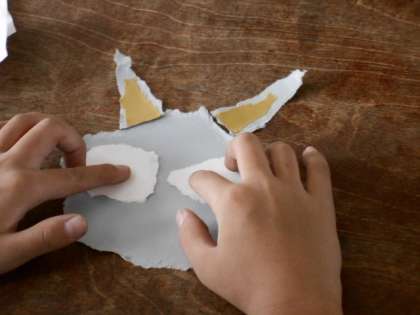 色画用紙をちぎって組み合わせて猫を作っています。