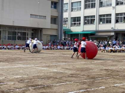 その後は、大玉ころがし!息をあわせてごろごろごろ!次の人にバトンタッチ!