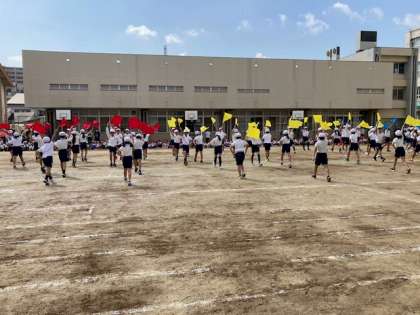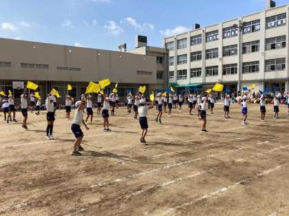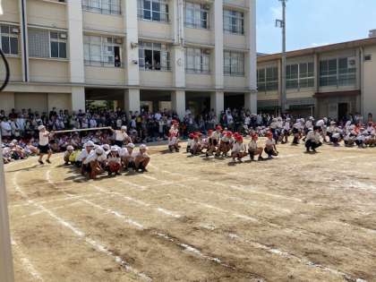 1本の棒をチームで台風のようにグルーン!グルーン!とまわして運び最後は、チームの足元と頭の上を通って次の人に渡します。