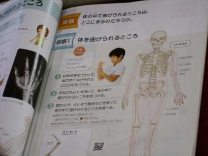 筋肉や骨について自分の腕を曲げたり肘を触ったりして体の曲がるところを見つけました。