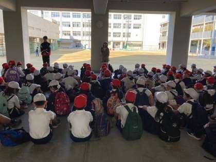 出発前にピロティで今日のめあてを確認して出発します。