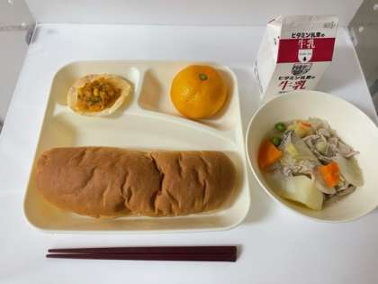 豚肉と野菜のスープ煮、変わりピザ、みかん、黒糖パン、牛乳