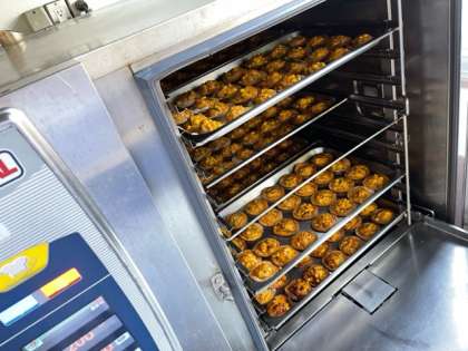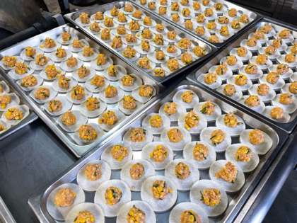 給食室で変わりピザを作っているようすです。鉄板の上にぎょうざの皮を敷き、その上にピザソースやツナなどを混ぜ合わせた具をのせて、焼きます。児童に好評な献立です。