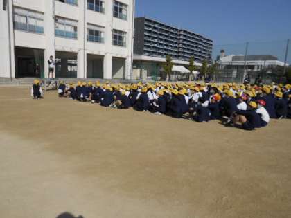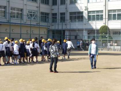 まずは、運動場に集まって校長先生や担当の先生のお話を聞きました。