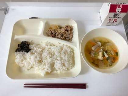 豚肉のスタミナ焼き、すまし汁、のりのつくだ煮、ごはん、牛乳