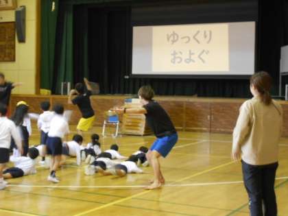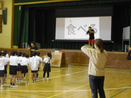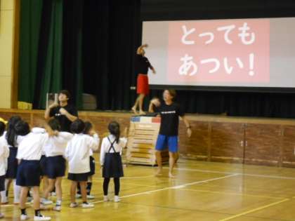 はじめに、ジェスチャーゲームで体を使っていろいろな動きや様子を表しました。