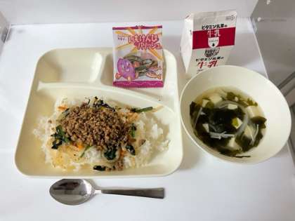 ビビンバ、わかめスープ、いもけんぴフィッシュ、牛乳