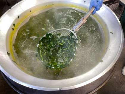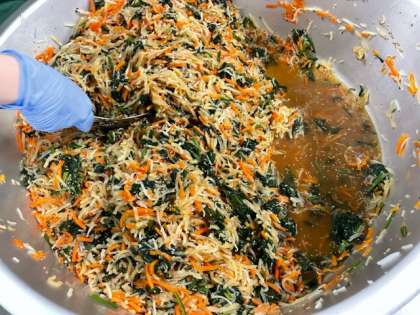給食室でビビンバを作っているようすです。だいこん、にんじん、もやし、ほうれんそうをゆでて味つけをします。ひき肉と一緒にお皿に盛り付けます。