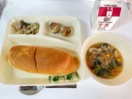 焼きシューマイ、中華みそスープ、ツナと野菜のオイスターソースいため、コッペパン、マーガリン、牛乳