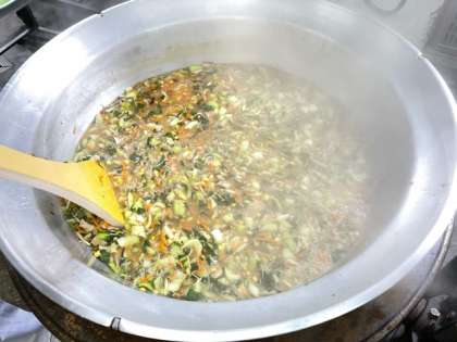 給食室で中華みそスープを作っているようすです。中華スープの素、塩、こしょう、うすくちしょうゆ、赤みそで味付けしています。