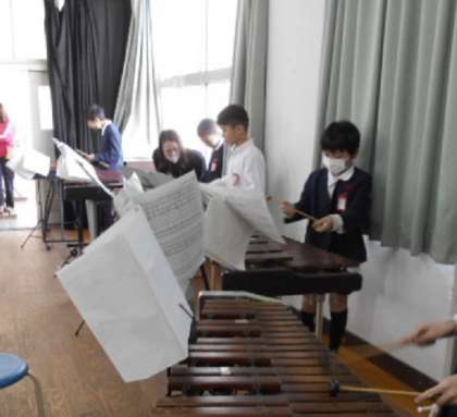 鉄琴や木琴、リズム楽器にオルガンなどいろいろなパートに分かれて練習です。
