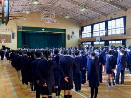 式の最後に校歌も歌いました。「げ〜んきで げん〜きで♪・・・」と子どもたちの元気な声が講堂いっぱいに響きました。