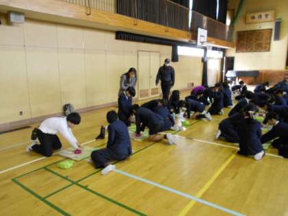 押す場所や姿勢、速さなどの説明の後、城東消防署から胸骨圧迫の練習ができる道具をお借りして一人ずつ2分×2セットの練習をしました。