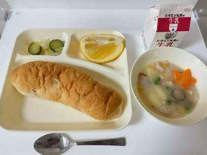 黒糖パン、牛乳、鶏肉とコーンのシチュー、キャベツときゅうりのサラダ、かわちばんかん