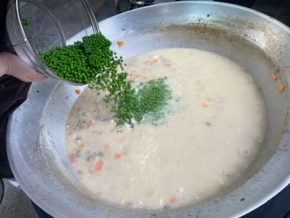 給食室で「鶏肉とコーンのシチュー」を作っているようすです。