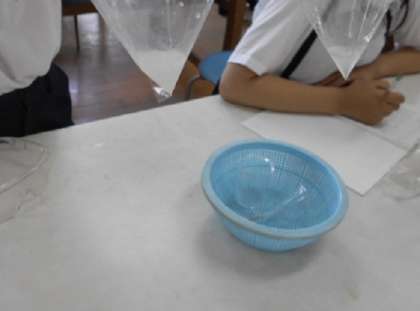 集めた空気と、吐いた息をそれぞれ袋に集め石灰水を入れて実験しました。