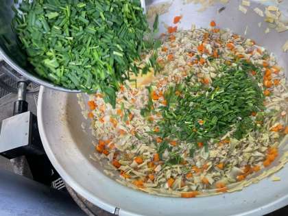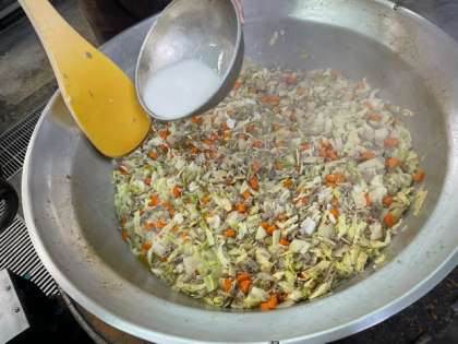豚肉、キャベツ、たまねぎ、たけのこ、にんじん、にらが入っています。でんぷんでとろみをつけています。