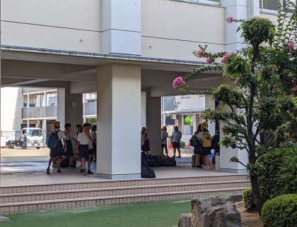 5年生の子どもたちは今日、明日と貝塚にある大阪府立少年自然の家に林間学習に行きます。8:30の集合ですが続々と子どもたちが登校してきています!