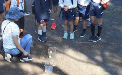 離れたところからピンポン玉をケースの中に入れます。