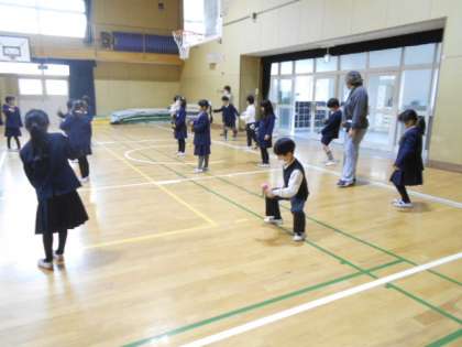まず始めは、けん玉の持ち方と体の使い方♪ ひざを曲げてリズムを取って落とさないように・・・