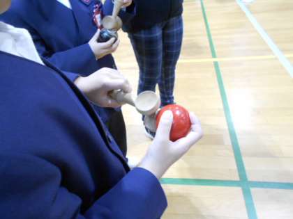 額にけん玉を当てて角のようにして、恐竜に変身!
