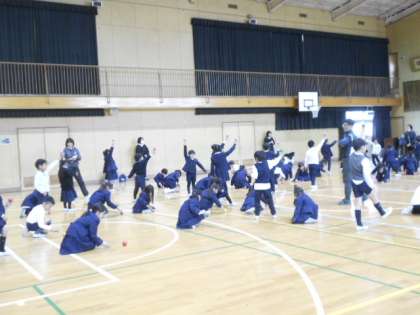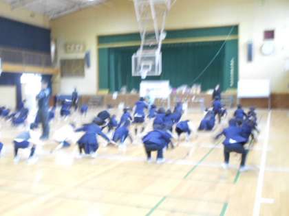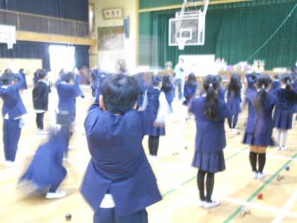床にけん玉を置いて手前に引いて玉の穴にさします。