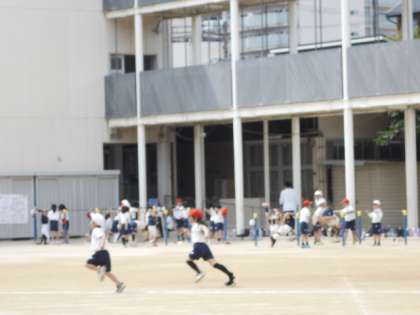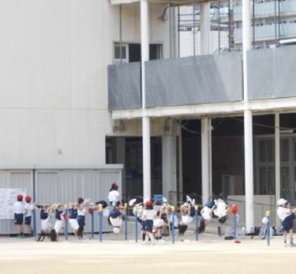 運動場で元気いっぱいに学習しています。