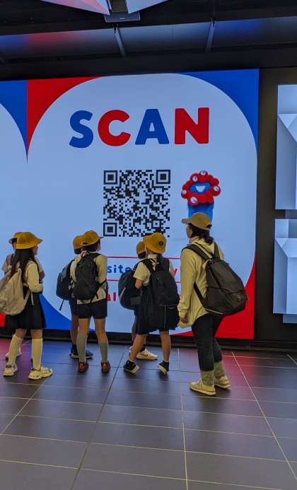 夢洲の駅に入りました。大型スクリーンのミャクミャクと一緒に踊ります♪