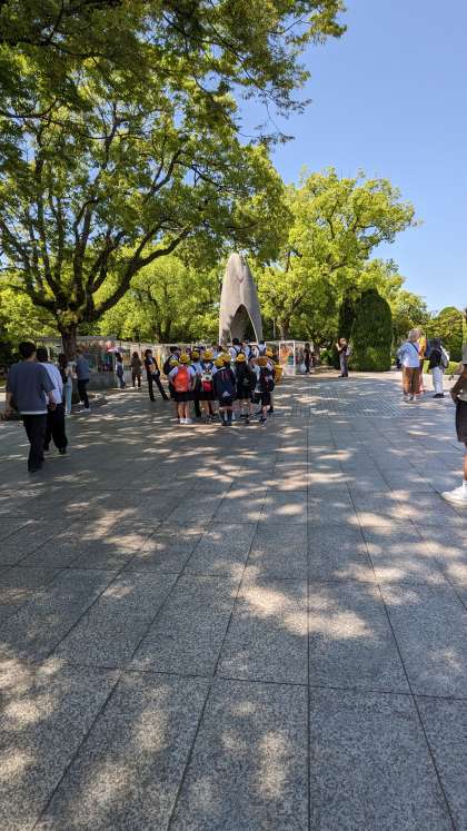 原爆の子の像の前で当時の様子やこの碑についてのお話を聞きます。
