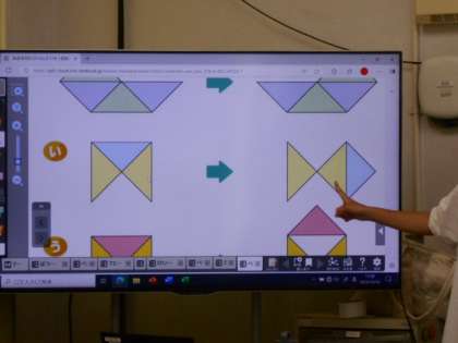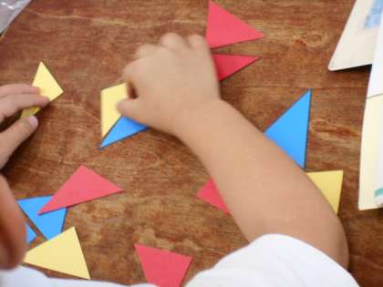 「赤の三角がお屋根になるように、こう、ぱったんってします。」「ひっくりかえすの」