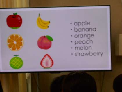 英語ではフルーツの名前を英語で発音したり、自分のカードを見せずに同じフルーツカードの友達を集めるゲームをしていました。