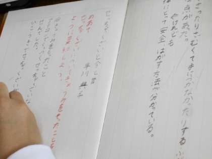 タブレットに表示された文章の中から大事な言葉を見つけて線を引き、自分の言葉でまとめます。 -