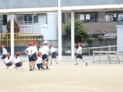 2つのグループに分かれてバトンを渡します。前の走者のスピードに合わせてスタートを切ります!