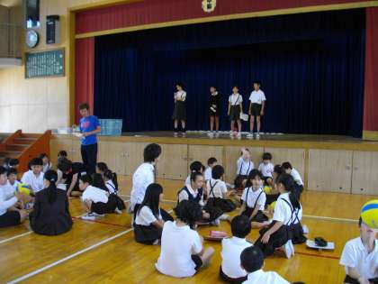 縦割り班で輪になってボールを回しながら、音楽が鳴りやんだ時にボールを持っていた人が自己紹介等をするゲームです。