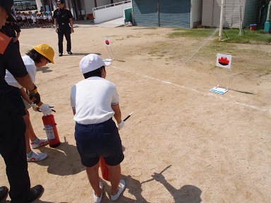 火災を想定した避難訓練ののち、講堂で全学年が煙中体験、運動場で6年生が水消火器体験をしました。