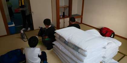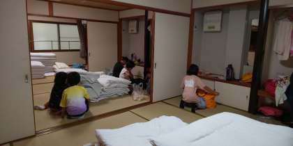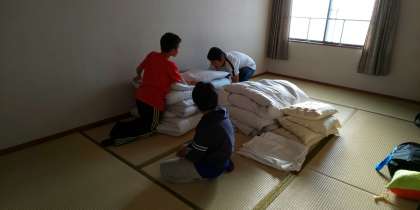 食事係さんが食事の準備に行っています。その間にみんなで部屋の片づけをしています。