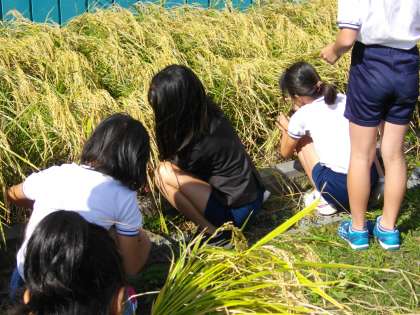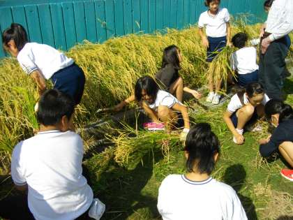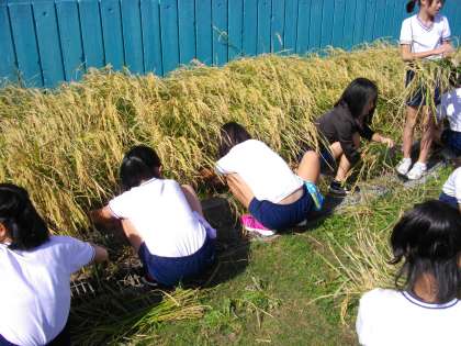 児童は皆、経験したことのない「カマ(鎌)を使っての稲刈り」に夢中です。