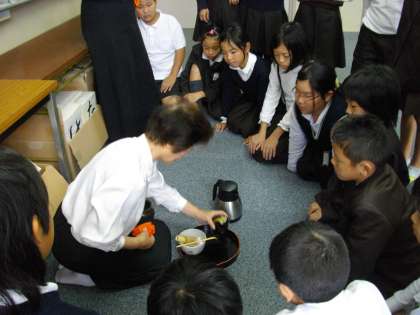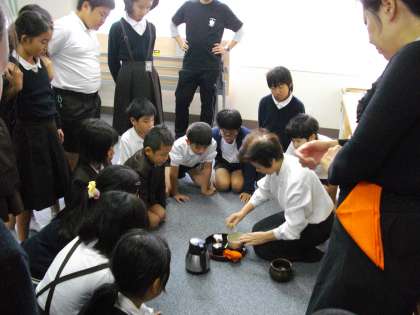 ほとんどの児童が茶道を体験したことも、自分で作った抹茶を飲んだこともないとのことでしたが、子どもたちは、作法に従い、きちんと正座し、器用に茶筅でかき回して、おいしいお茶を作っていました。