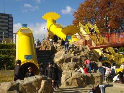 見学終了後、天神橋筋商店街を見学しながら、扇町公園に行き、ほんの少しだけ遊具で遊びました。そこには「大阪くらしの今昔館」を見学したらしい、たくさんの小学生が集まっていました。