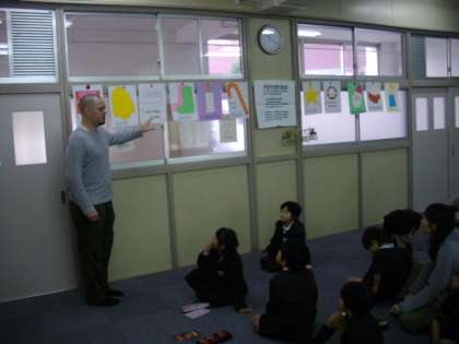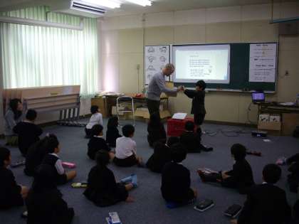 校区にお住いの地域の外国人、カート先生(オーストラリア人)にお願いをして、低学年の児童に対して英語の授業をしていただいています。