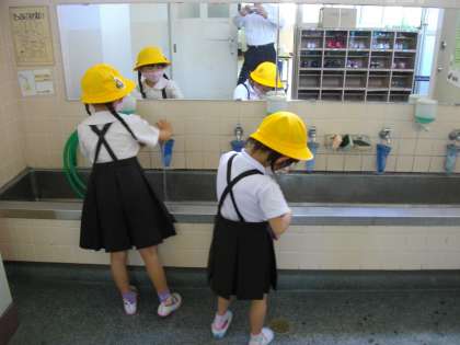 写真は1年生の手洗い、2・3年生の学級の様子です。