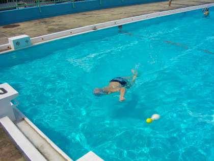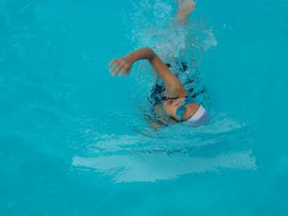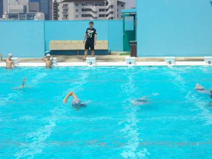 6年生は、25mプールを縦に使い、25m以上泳ぐことにチャレンジしています。