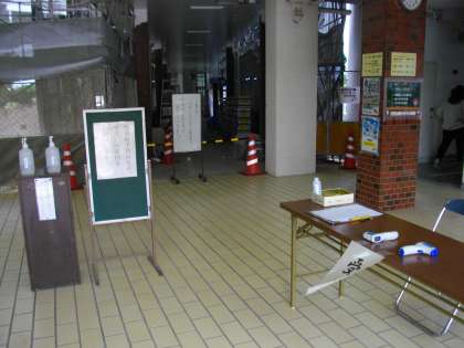 正面玄関では、保護者の方に検温、アルコール消毒、マスク着用をお願いしています。
