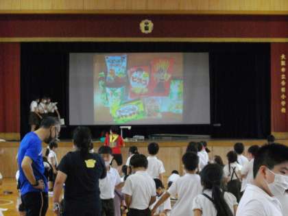 今日は、子どもたちが普段よく食べているお菓子をスクリーンに映して、そのお菓子の名前を当てるクイズでした。