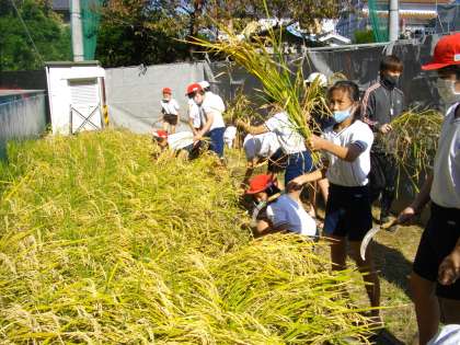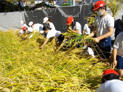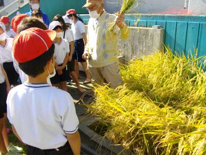 毎年、ボランティアの林さんのご指導により、5年生が校内の「田んぼ」で田植えをし、秋には自分たちで稲刈りをします。その刈り取った稲を、2週間ほど乾燥させ、12月ごろに脱穀します。そして、最後には、みんなでお米を炊いて、一緒に食べる予定です。