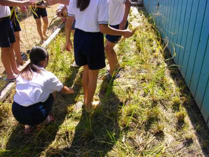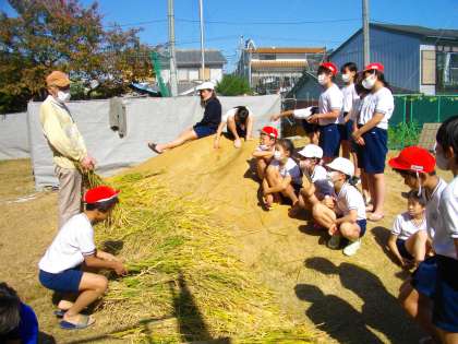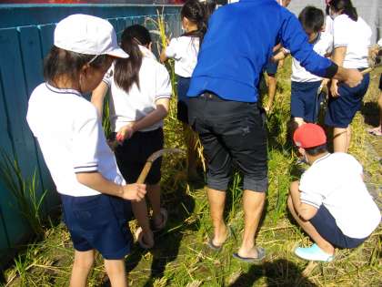 子どもたちは、だれも稲刈りを経験していないようです。まして、「カマ(鎌)を使っての稲刈り」となると、どのように使ってよいのかも全く分からないようでした。